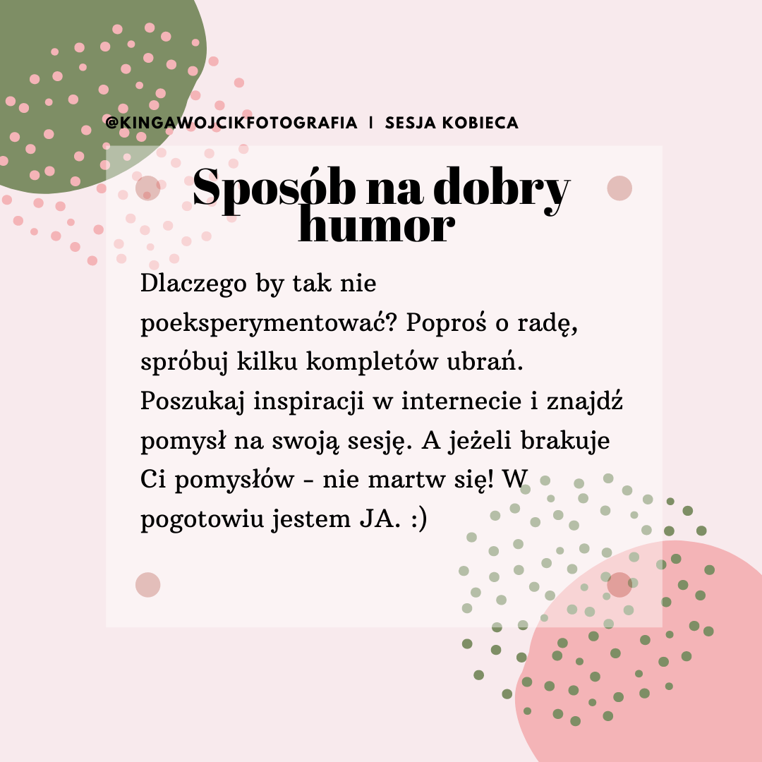 Dlaczego by tak nie poeksperymentować? Poproś o rade, spróbuj kilku kompletów ubrań. Poszukaj inspiracji w Internecie i znajdź pomysł na swoja sesje. A jeżeli brakuje Ci pomysłów – nie martw się! W pogotowiu jestem JA. ![]()
